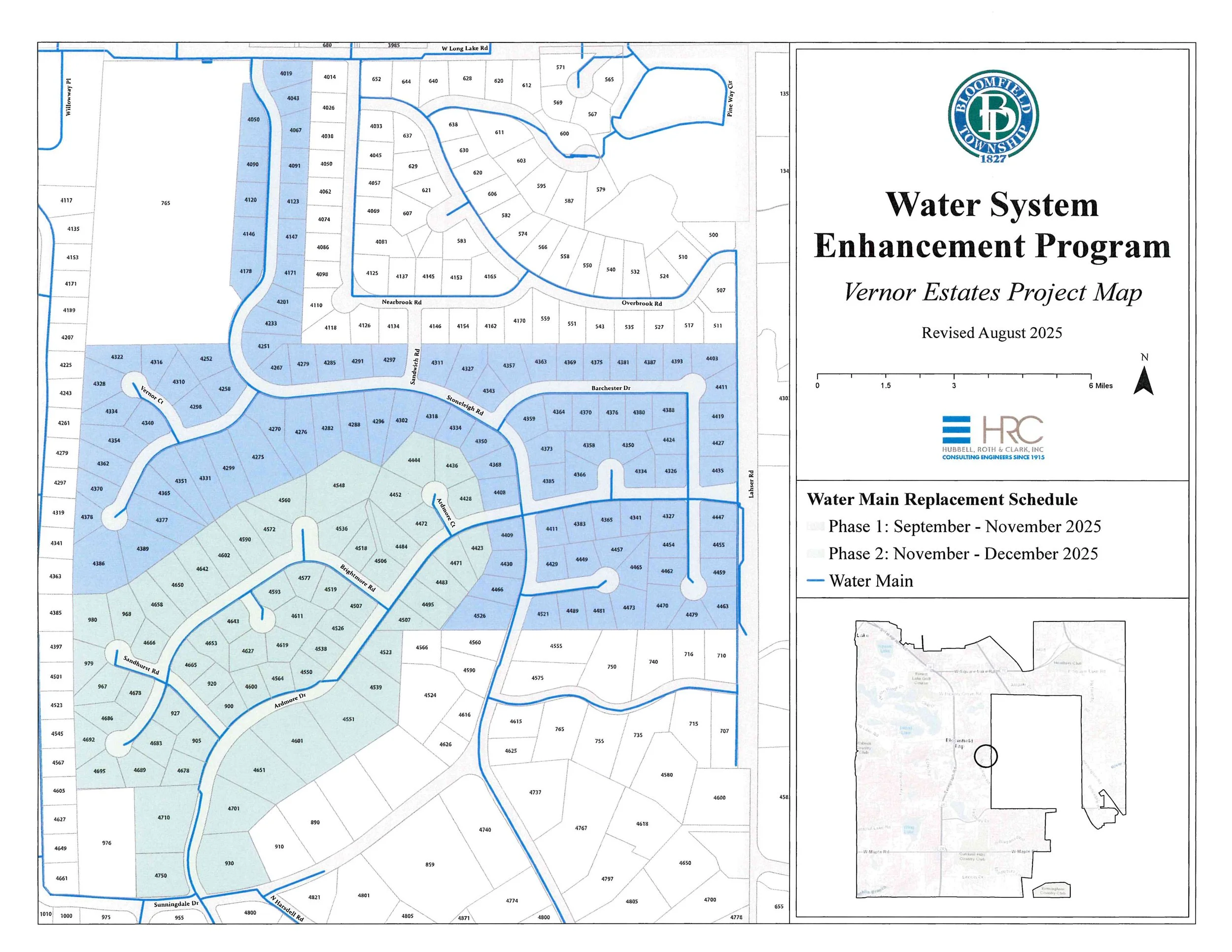 Construction is anticipated to start in the Summer of 2025. Additional notices will be provided to residents prior to the disruption of water service. The Bloomfield Township Fire Department is also aware of the water main replacement program to ensure access to the area is always available. These water system enhancements will provide the residents with a more reliable water system, improve water flow, and lessen the chances of water service loss due to emergency water system repairs.