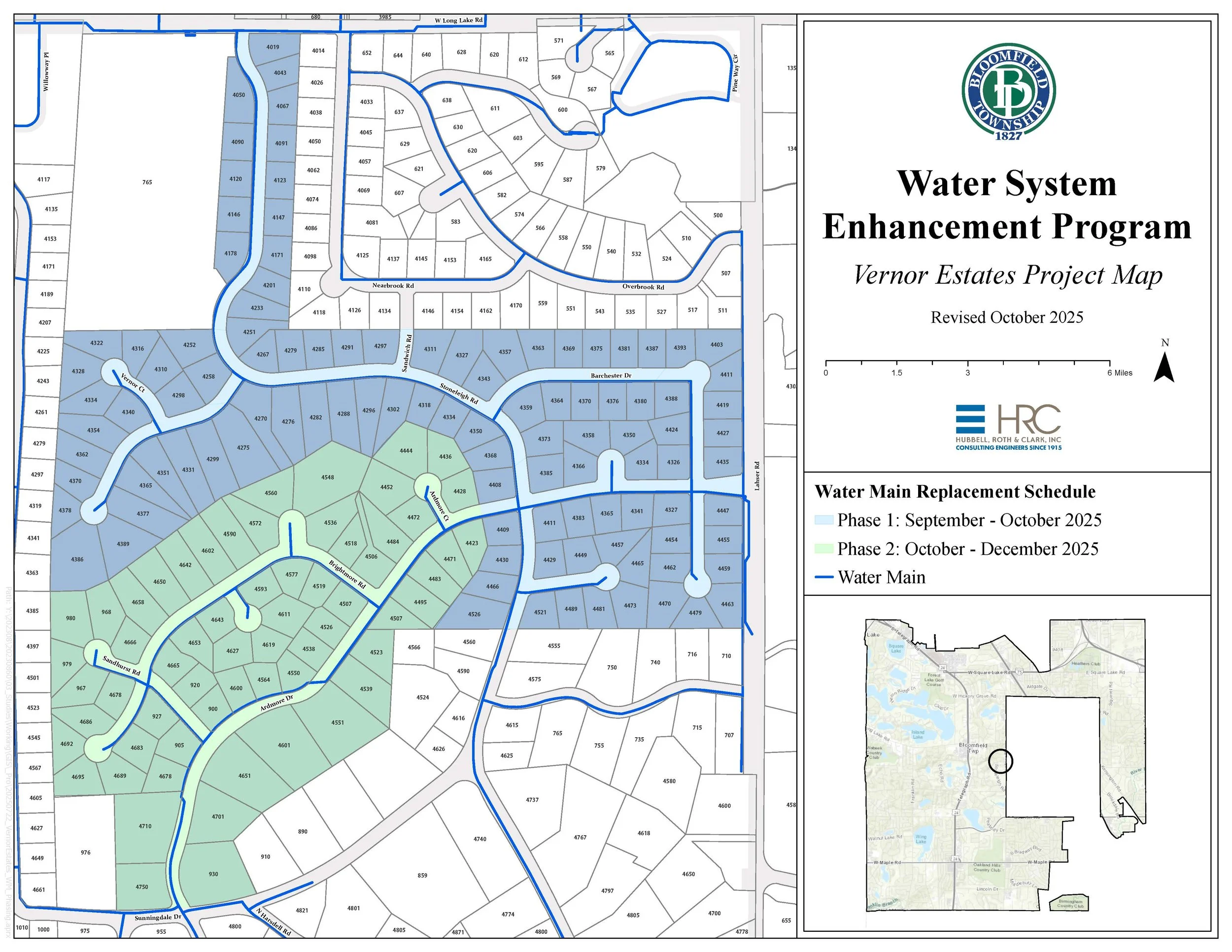 Construction is anticipated to start this month. Additional notices will be provided to residents prior to the disruption of water service. The Bloomfield Township Fire Department is also aware of the water main replacement program to ensure access to the area is always available. These water system enhancements will provide the residents with a more reliable water system, improve water flow, and lessen the chances of water service loss due to emergency water system repairs.